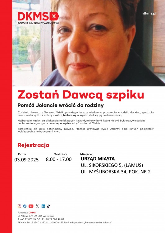 – Pani Jola w Urzędzie Miasta Gorzowa Wielkopolskiego pracuje od 1995 roku. Obecnie związana z Wydziałem Administracyjnym, zawsze pomocna, uśmiechnięta, serdeczna – dziś potrzebuje pomocy. Zachorowała na ostrą białaczkę. Aby mogła wrócić do zdrowia, konieczny jest przeszczep szpiku.