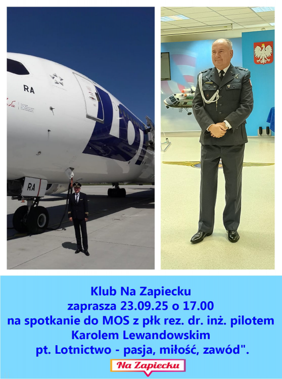 Klub Na Zapiecku zaprasza 23 września o godz. 17 do Miejskiego Ośrodka Sztuki przy ul. Pomorskiej 73 na spotkanie z płk. rez. dr. inż. pilotem Karolem Lewandowskim z Warszawy.