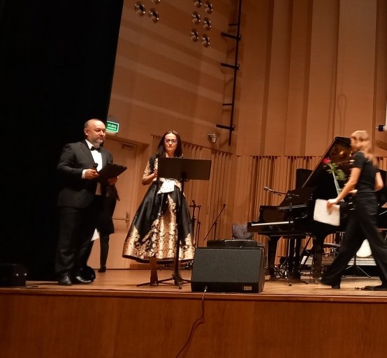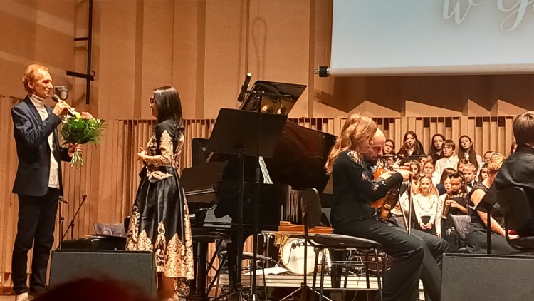 Jubileuszową galę prowadzili dyrektor szkoły Marta Machunik i nauczyciel Krzysztof Ciesielski – kontrabasista, gitarzysta basowy, syn Patrona szkoły.