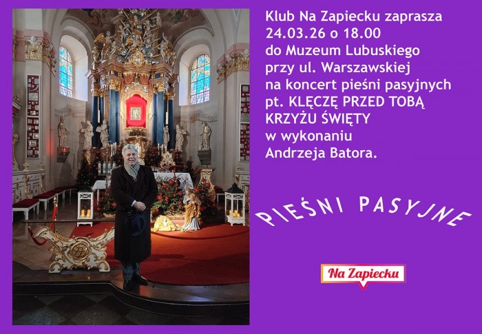 Klub Na Zapiecku serdecznie zaprasza 24.03.26 o 18.00 w gościnne progi Muzeum Lubuskiego przy ul, Warszawskiej na Koncert pieśni pasyjnych pt.”KLĘCZĘ PRZED TOBĄ KRZYŻU MÓJ” w wykonaniu barytona z Warszawy Andrzeja Batora.