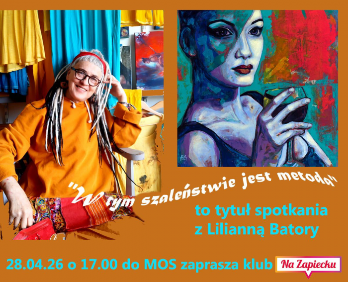 Klub Na Zapiecku zaprasza 28 kwietnia 2026 o 17.00 do Miejskiego Ośrodka Sztuki przy ul. Pomorskiej 73 na spotkanie z artystką plastyczką, absolwentką Państwowej Wyższej Szkoły Sztuk Plastycznych w Poznaniu, gdzie w 1992 roku uzyskała dyplom z wyróżnieniem. Na Fb występuje jako Lilianna Lilu Lazarska oraz Lilianna Lilu Batory.